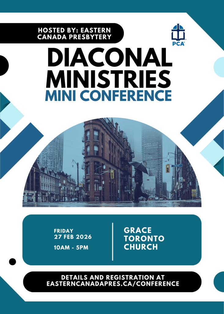 The Eastern Canada Presbytery would like to invite all those serving in diaconal roles in PCA Churches in Eastern Canada to a mini conference on February 27 at Grace Toronto Church. This event is open to ordained deacons, those appointed to assist the deacons and those who serve in other care/mercy roles. Men and women are welcome.
